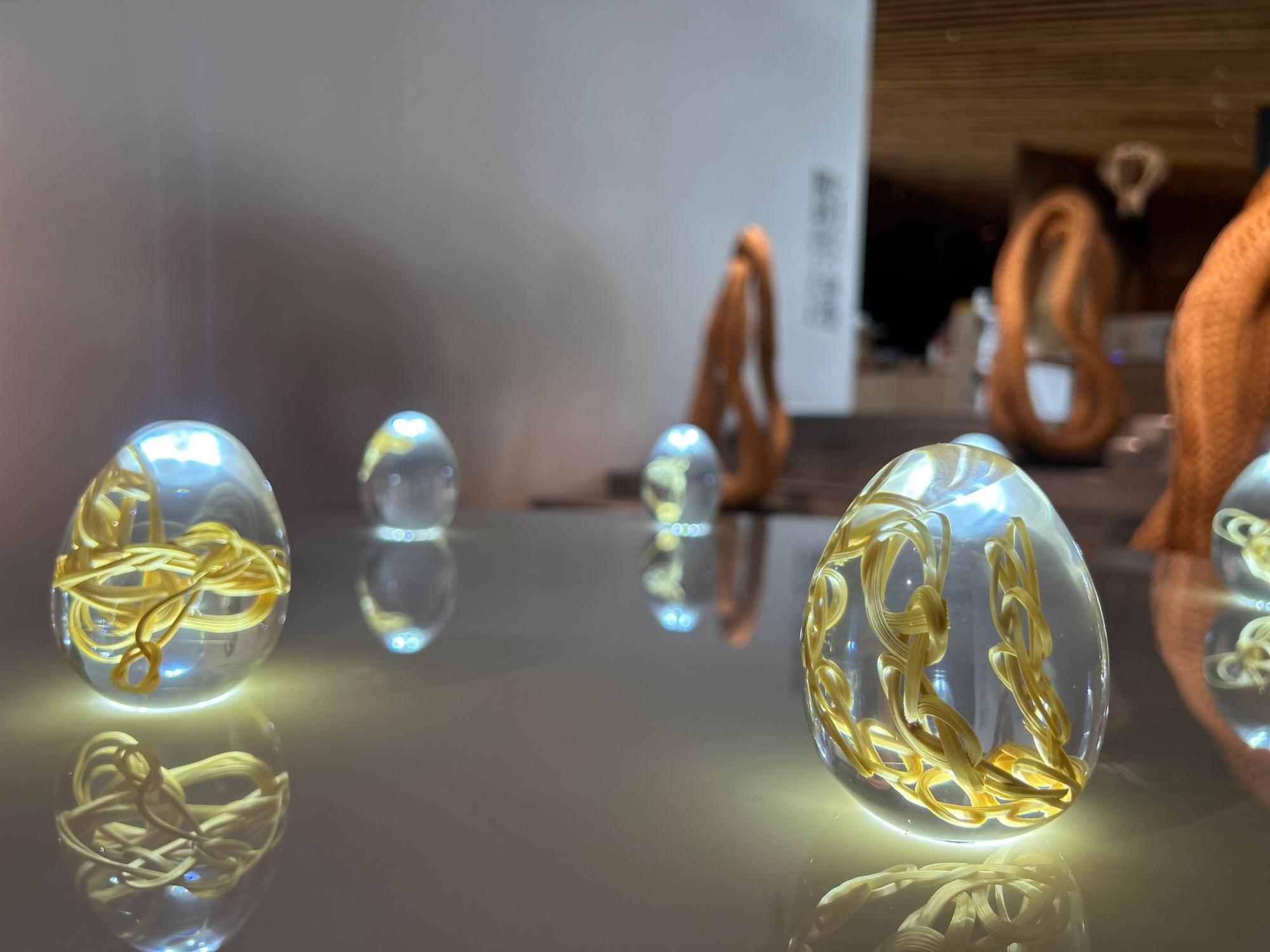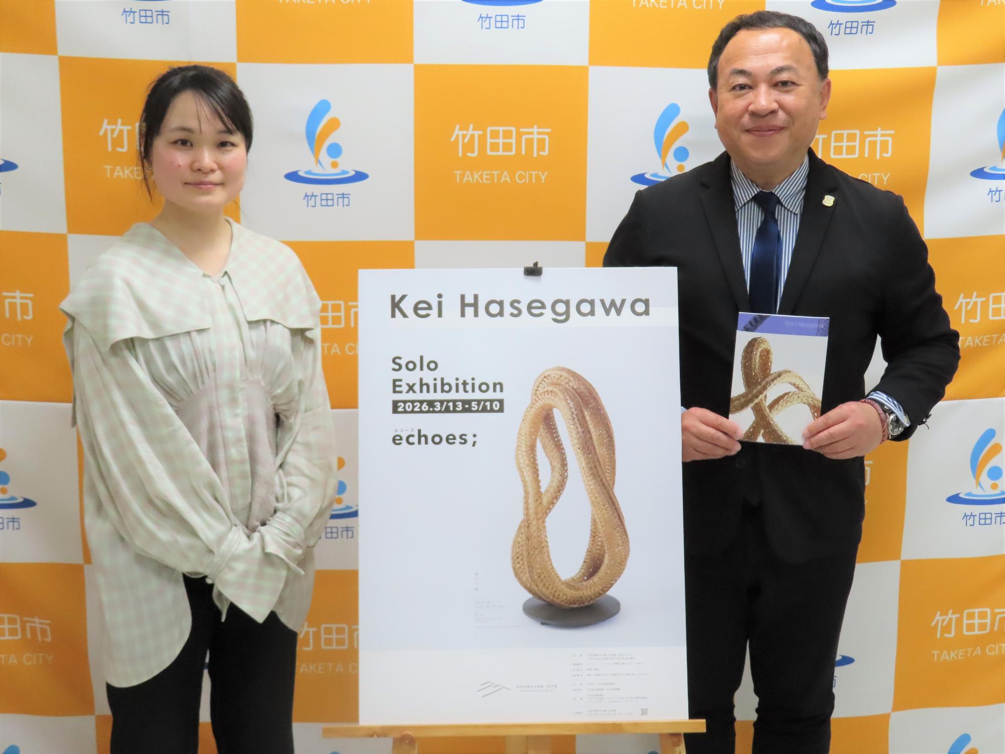 本展で紹介する長谷川絢さんは、竹田市を制作拠点として活動している新進気鋭の美術家です。2014年に竹田市に移住し、2017年から竹の伝統技法である「束ね編み」を独自に発展させた「筒束ね編み」を用いた彫刻作品をはじめ様々な作品を制作・発表しています。2017年、日本美術展覧会に新入選し、第22回全国竹芸展で「萌芽」が最高賞の文部科学大臣賞を受賞しています。2024年には、第60回くらしの中の竹工芸展においてグランプリを受賞しました。また、2025年には、大分市美術館が文化庁の支援を受け竹工芸作家の育成と国際的な発信を目指した事業において育成対象となった作家の一人にも選ばれています。