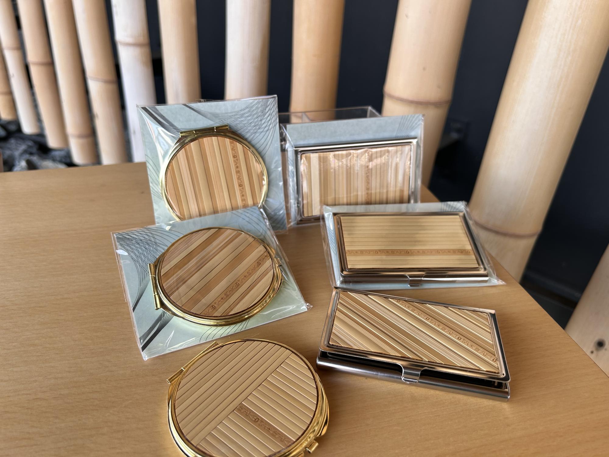 表面に竹ひごをあしらったコンパクトミラーと名刺入れになります。