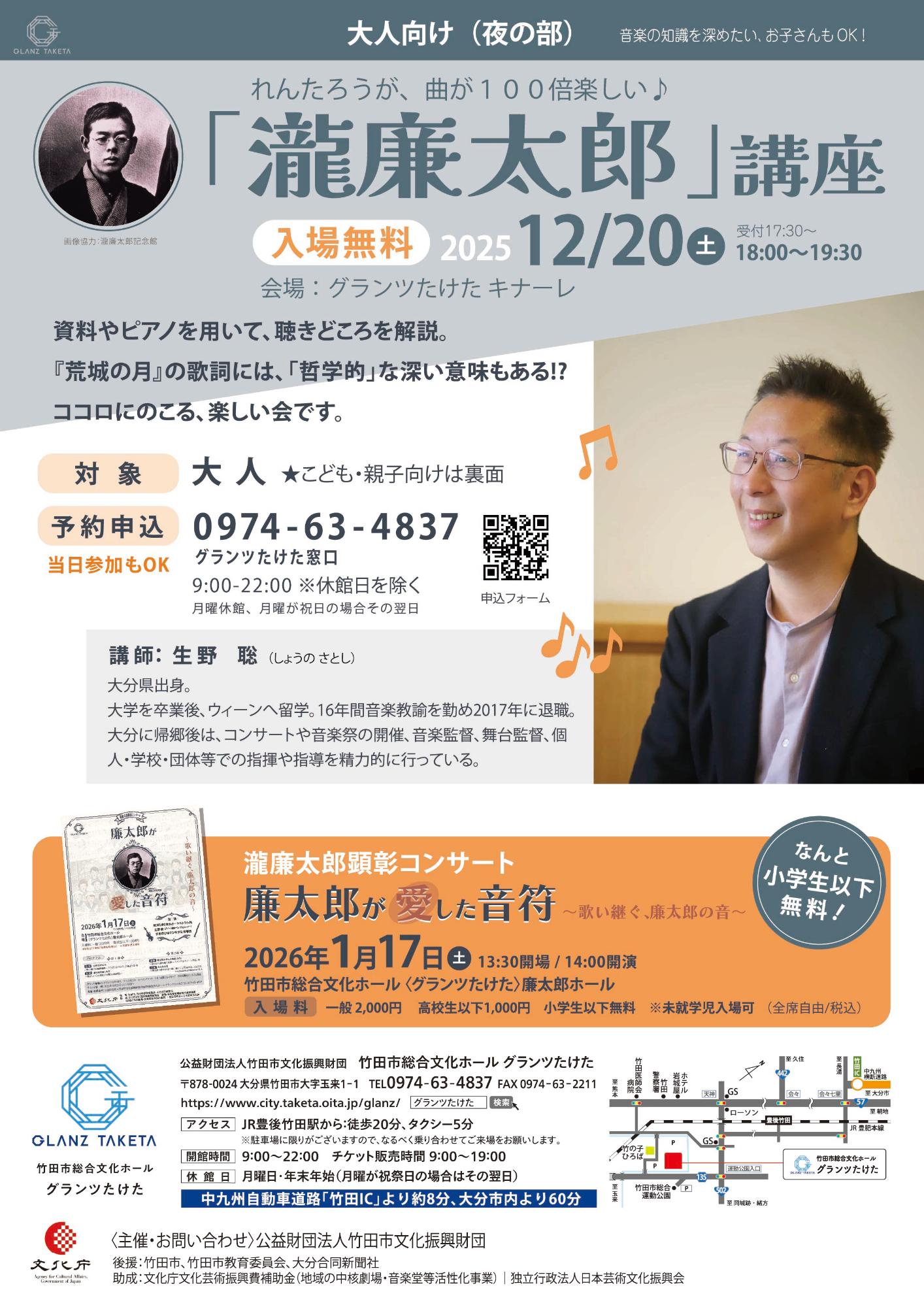 12/20(土曜日)キナーレにて、〔れんたろうが、曲が100倍楽しい♪「瀧廉太郎」講座〕を開催します!子どもも大人も楽しめる、音楽でつながる入場無料のイベントです。
