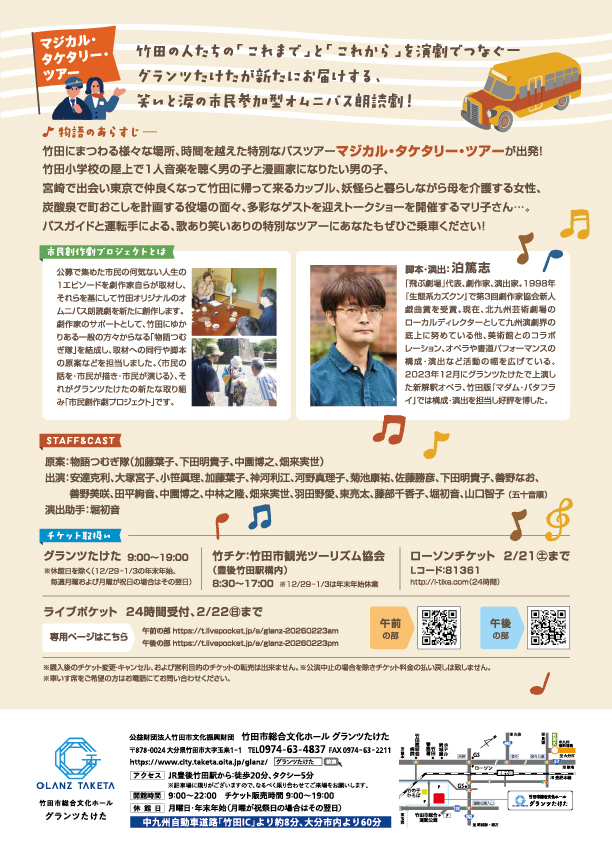 グランツたけたでは、2月23日(月祝)キナーレにて、市民創作劇プロジェクトの新作朗読劇「マジカル・タケタリー・ツアー」を上演します。
