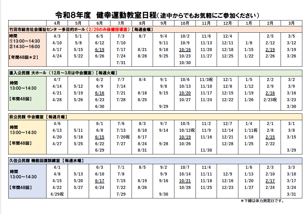 竹田市では、市民の皆さんが運動を習慣的に行える環境づくりを目指し、「運動」を始めて、「健やかに」・「幸せに」なる教室として「健幸運動教室」を開催します。