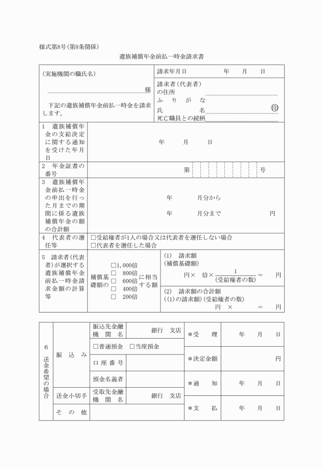 第9条 遺族補償年金を受ける権利を有する者が2人以上あるときは、これらの者は、そのうちの1人を遺族補償年金の請求及び受領についての代表者に選任しなければならない。ただし、世帯を異にする等やむを得ない事情のため、代表者を選任することができないときは、この限りでない。