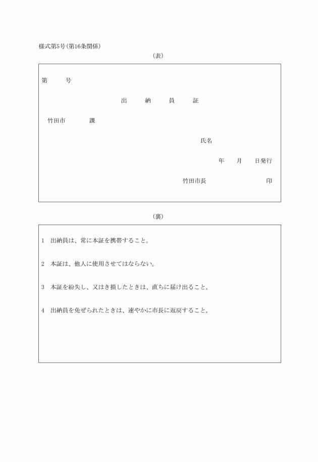 第16条 出納員は、様式第5号の証票を携帯し、他人の請求があるときは、これを示さなければならない。