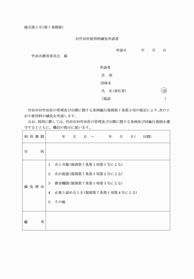 2 使用料の減免を受けようとする者は、使用料減免申請書(様式第5号)を管理者に申請しなければならない。ただし、本市が主催する行事に利用する場合は、この限りでない。