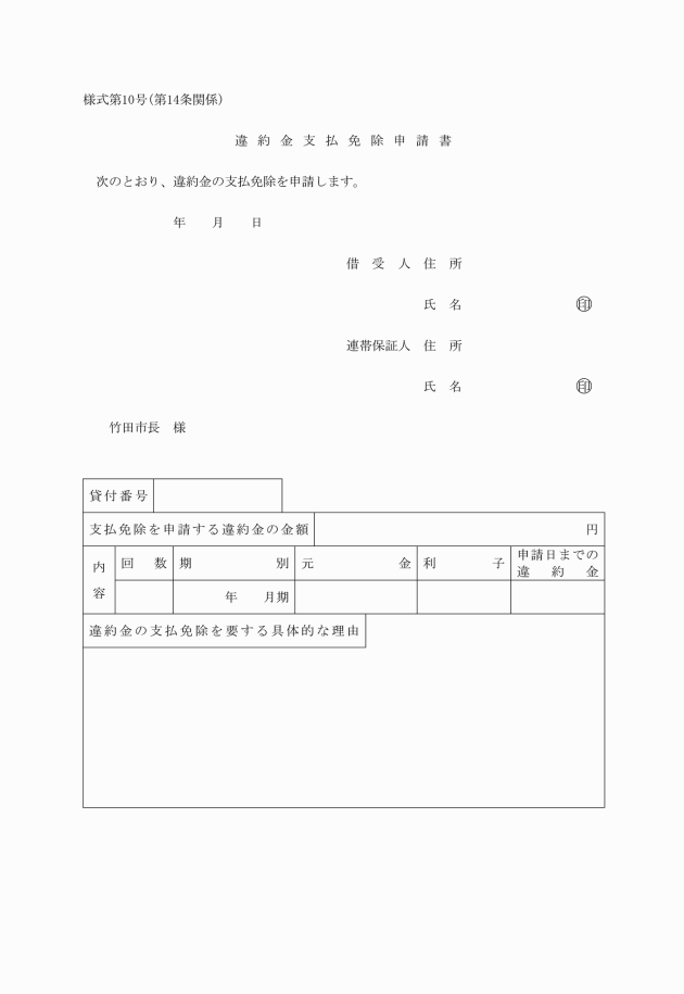 第14条 借受人は、違約金の支払免除を申請しようとするときは、その理由を記載した申請書(様式第10号)を市長に提出しなければならない。