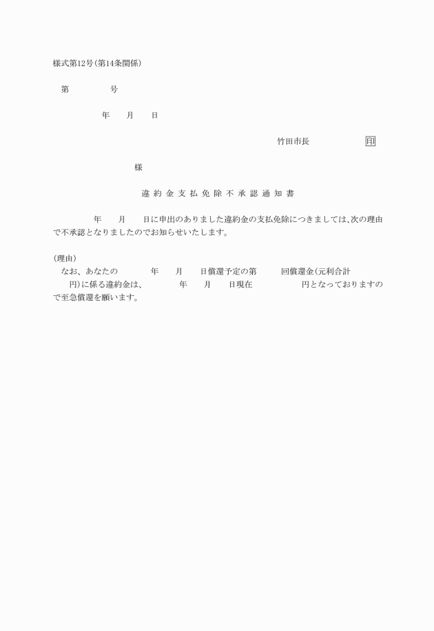 3 市長は、支払免除を認めない旨を決定をしたときは、違約金支払免除不承認通知書(様式第12号)を、当該借受人に交付するものとする。