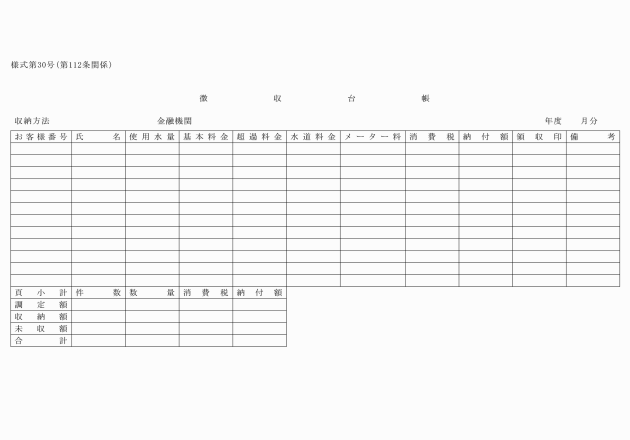 第8条 上下水道課長は、毎日発行された伝票の借方票及び貸方票を、勘定科目ごとに一連番号を付して整理保管し、勘定科目別にファイルされた伝票の月ごとに月計票(伝票枚数が極めて少数の場合は、月計票を用いないことも可)に集計記録し、総勘定元票に転記して行わなければならない。