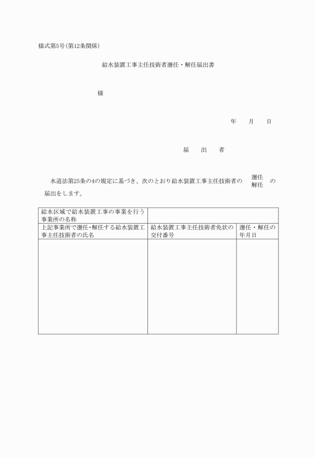 3 指定工事業者は、主任技術者を選任又は解任したときは、様式第5号による届出書により、遅滞なくその旨を管理者に届け出なければならない。