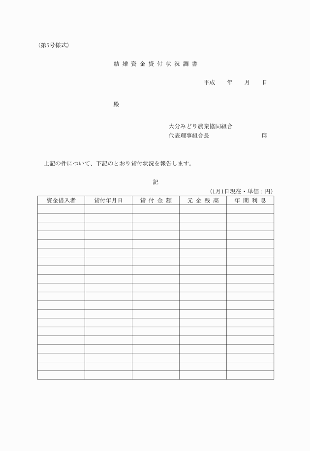 第10条 農協は、次年度1月10日現在の結婚資金貸付状況調書(第5号様式)を、町に提出するものとする。