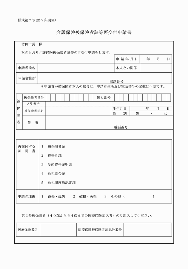 第7条 被保険者証又は負担割合証(以下「被保険者証等」という。)の交付を受けている者は、当該被保険者証等を破り、汚し、又は失ったときは、省令第27条第1項又は第28条第4項の規定により、直ちに介護保険被保険者証等再交付申請書(様式第7号)を市長に提出しなければならない。この場合において、被保険者証等を破り、又は汚したことを原因とするときは、同省令第27条第2項又は28条第5項の規定により、併せて当該被保険者証等を添付しなければならない。