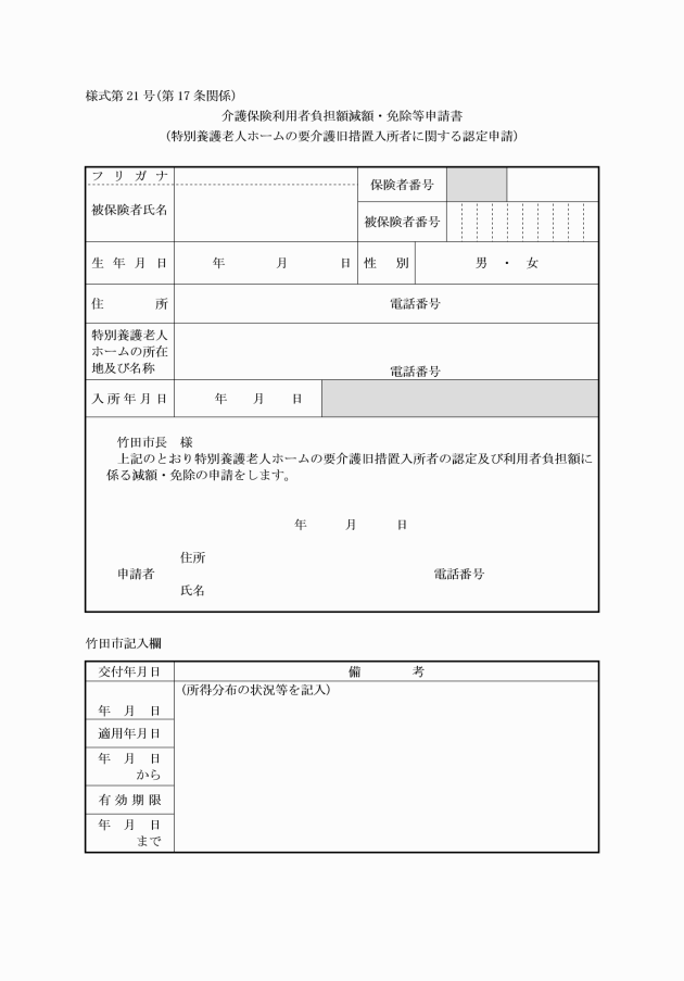 第17条 施行法第13条第3項に規定する施設介護サービス費の割合の変更による利用者負担額の減免の認定を受けようとする要介護旧措置入所者は、介護保険利用者負担額減額・免除等申請書(様式第21号)により市長に申請しなければならない。