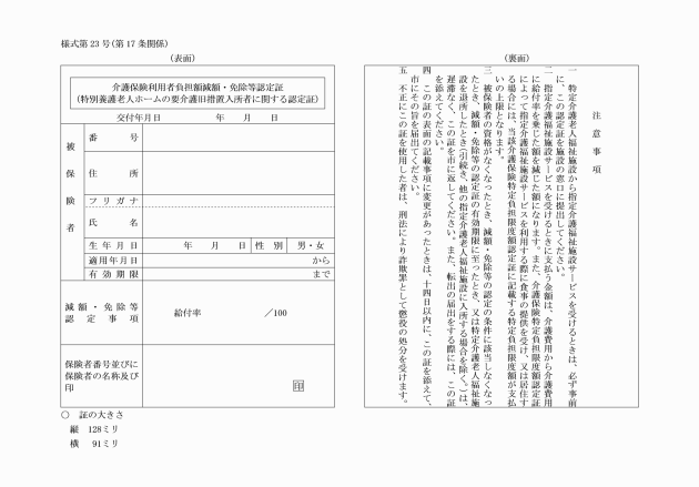 3 市長は、減免を決定したときは、その期間及び介護給付の割合等を記載した介護保険利用者負担減額・免除等認定証(様式第23号)を交付するものとする。