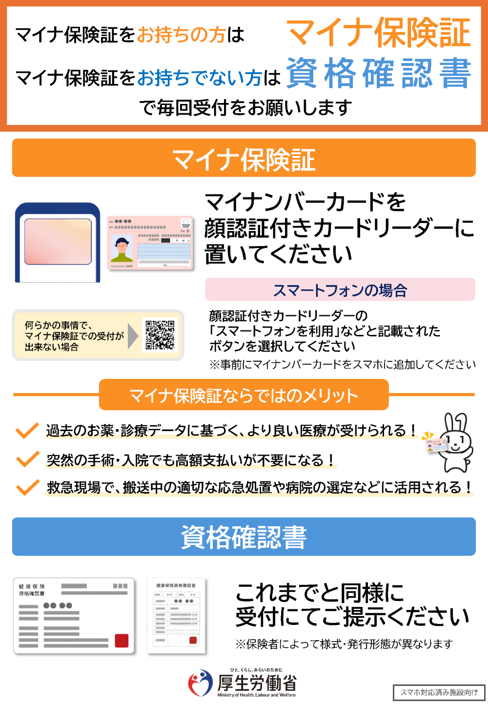 受付では、マイナ保険証をお持ちの方は「マイナ保険証」を、マイナ保険証をお持ちでない方は「資格確認書」を毎回ご提示ください。