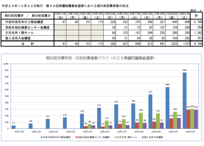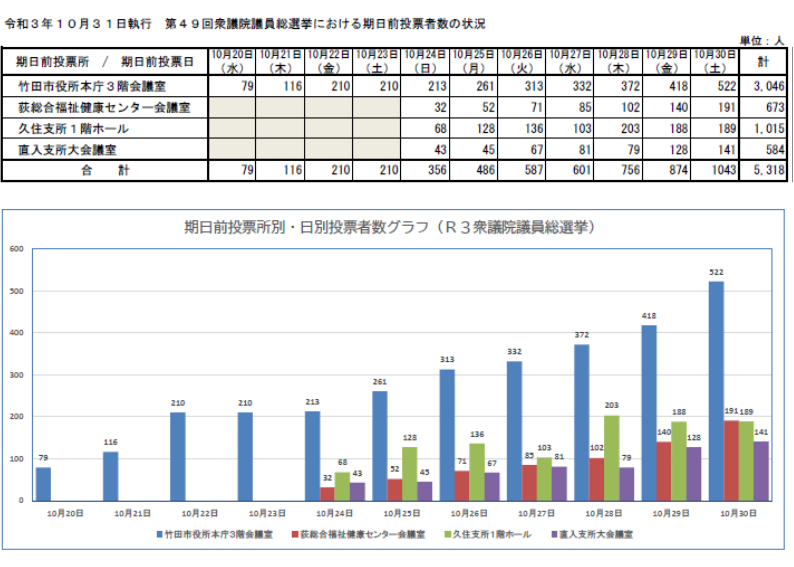 衆議院議員総選挙における期日前投票者数の状況 Tweet 更新日:2024年10月17日 令和3年執行 第49回衆議院議員総選挙における期日前投票者数の状況(PDFファイル:337.2KB) 平成29年執行 第48回衆議院議員総選挙における期日前投票者数の状況(PDFファイル:338.4KB) この記事に関するお問い合わせ先 選挙管理委員会事務局〒878-8555大分県竹田市大字会々1650番地電話:0974-63-1111(内線360)お問い合わせはこちら