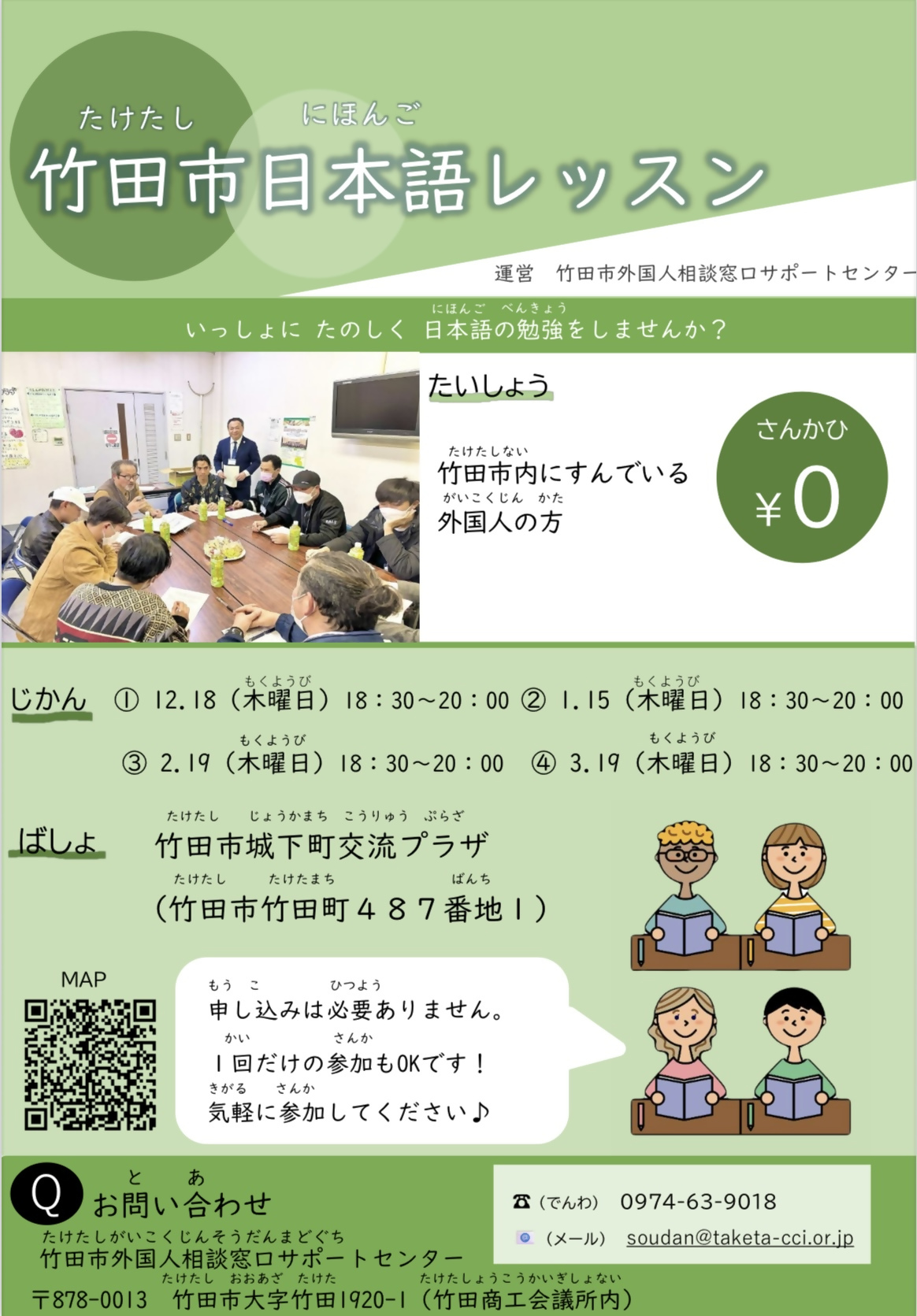 竹田市(たけたし)に住(す)む外国人(がいこくじん)の方(かた)向(む)けに日本語教室(にほんごきょうしつ)をしています。