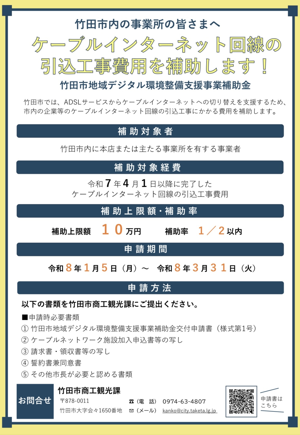 竹田市では、ADSLサービスからケーブルインターネットへの切り替えを支援するため、市内の企業等のケーブルインターネット回線の引込工事にかかる費用を補助します。