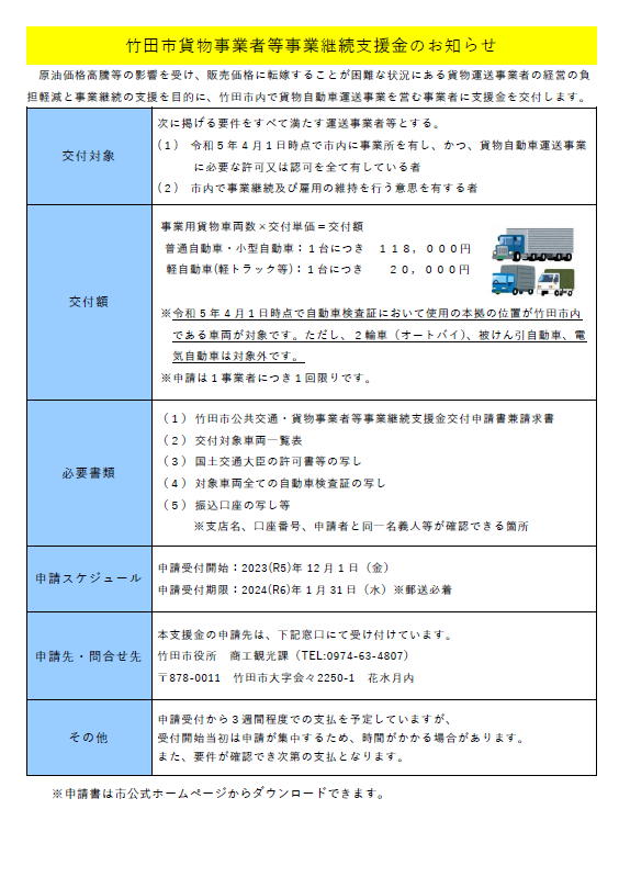 竹田市貨物運送事業者等事業継続支援金のお知らせ