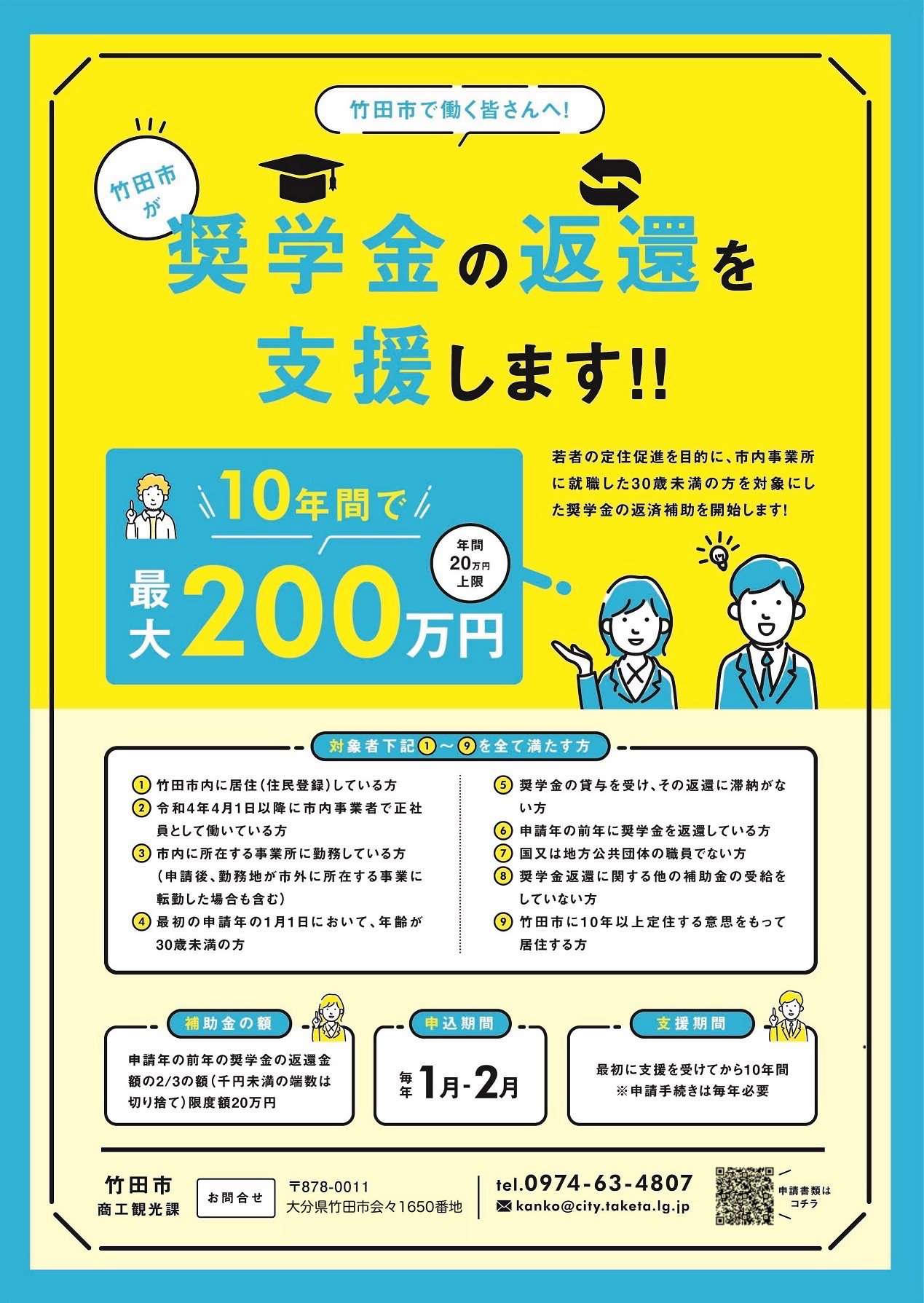 市内の就業推進と定住促進を図ることを目的に、市内事業所に就職した30歳未満の方を対象に奨学金の返還を補助します!