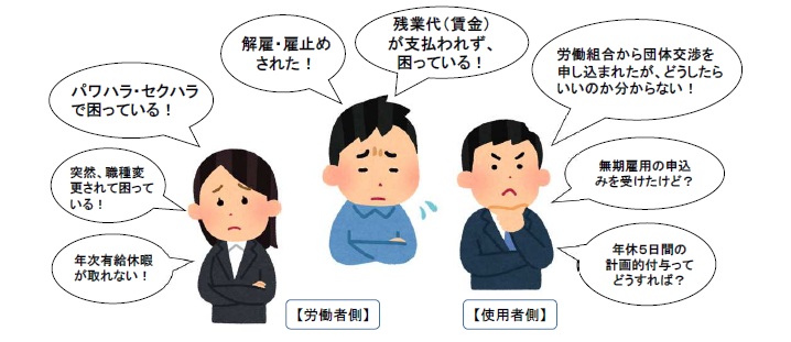 労働委員会は、労使紛争を解決するための専門的な行政機関です。労働相談では、専門的なアドバイスのほか、内容に応じて労働委員会の「あっせん」や適切な機関を紹介します。