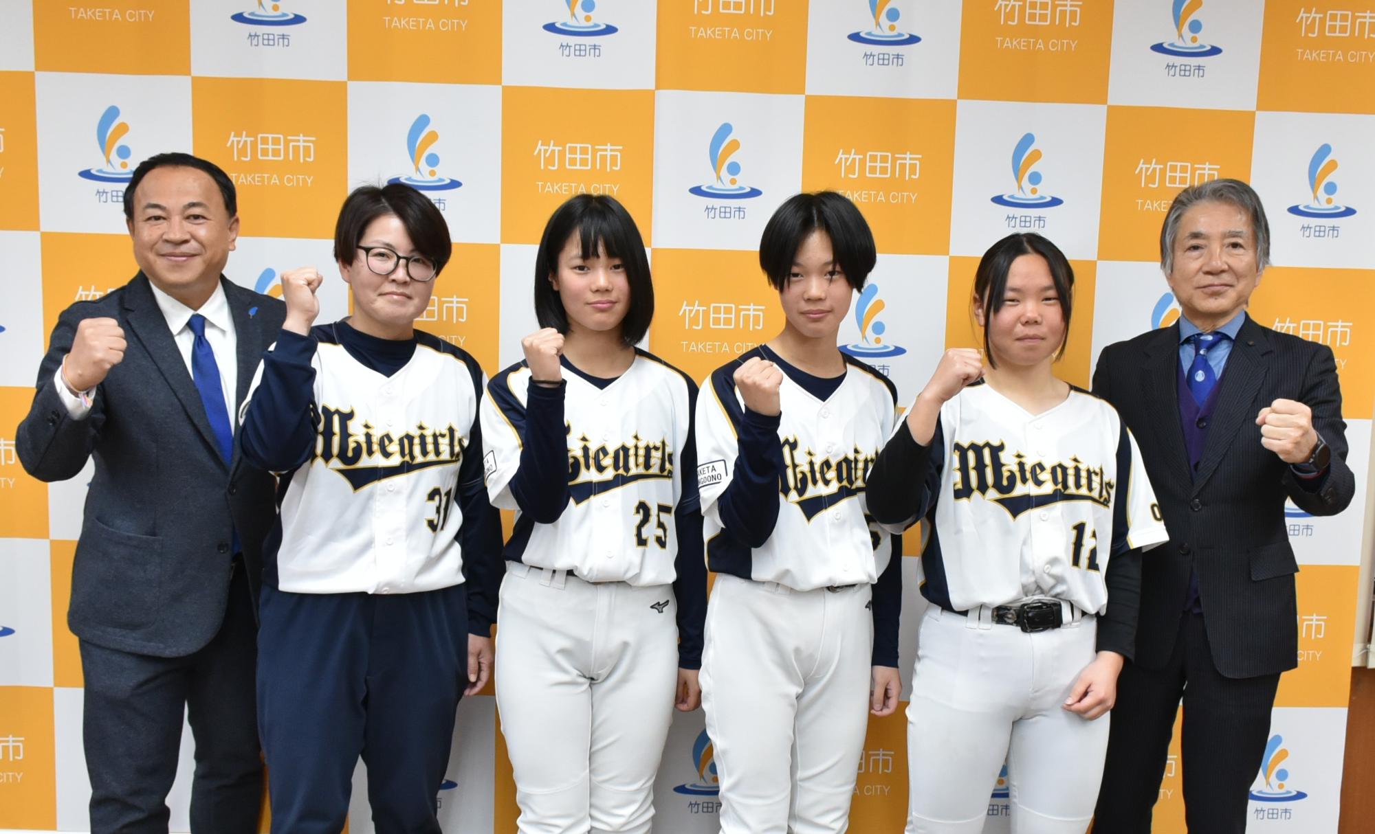 令和8年2月22日(日曜日)~23日(祝・月)にかけて福岡県筑紫野市・大宰府市で開催される「第36回全九州中学生選抜女子ソフトボール大会」に出場される、吉田 幸夕さん(竹田南部中学校1年生)・関 珠希さん(竹田南部中学校1年生)・関 望桜さん(竹田南部中学校1年生)が出場報告に来庁されました。