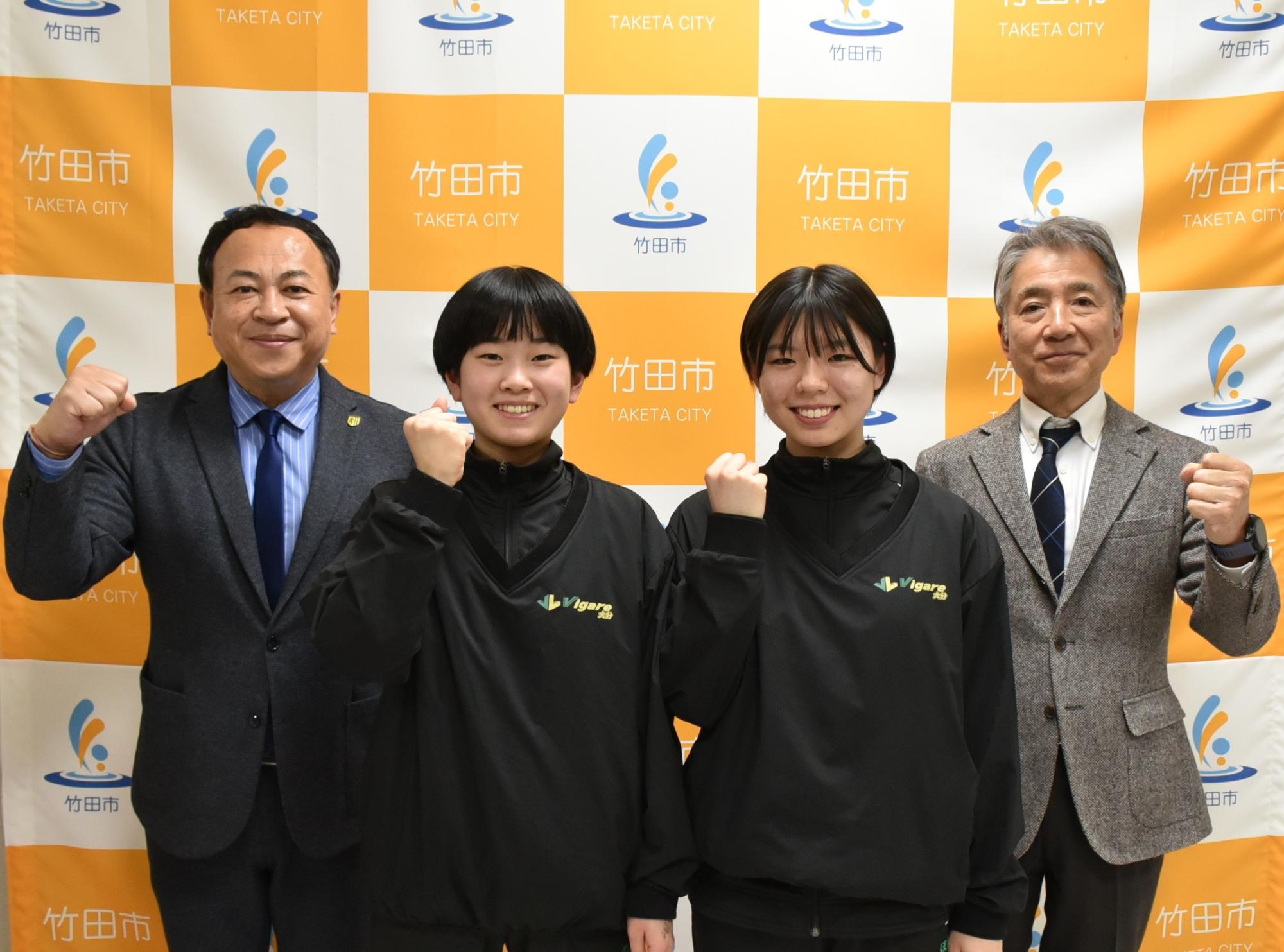 令和8年3月20日(金曜日)~22日(日曜日)にかけて沖縄県那覇市・豊見城市で開催される「京王観光カップ 第43回九州中学校バレーボール選抜優勝大会」に出場される、Vigare大分所属の高橋 ほたるさん(緑ヶ丘中学校2年生)と阿南 芽衣さん(直入中学校2年生)が出場報告に来庁されました。