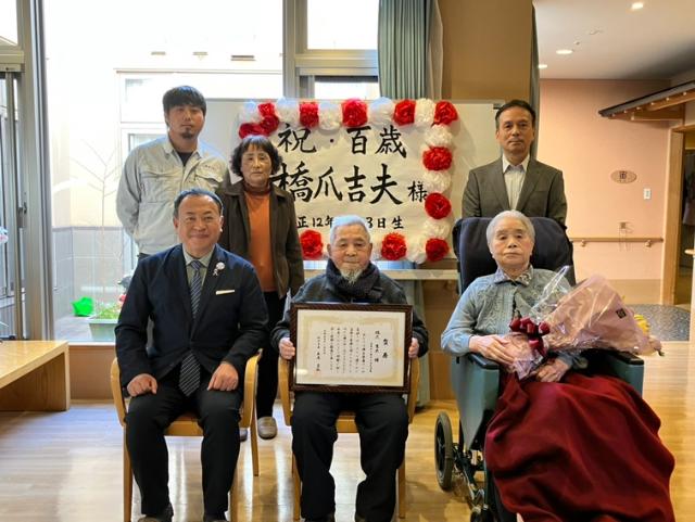 橋爪 吉夫さん(竹田市植木)の100歳をお祝いするため市内の特別養護老人ホームを訪問いたしました。
